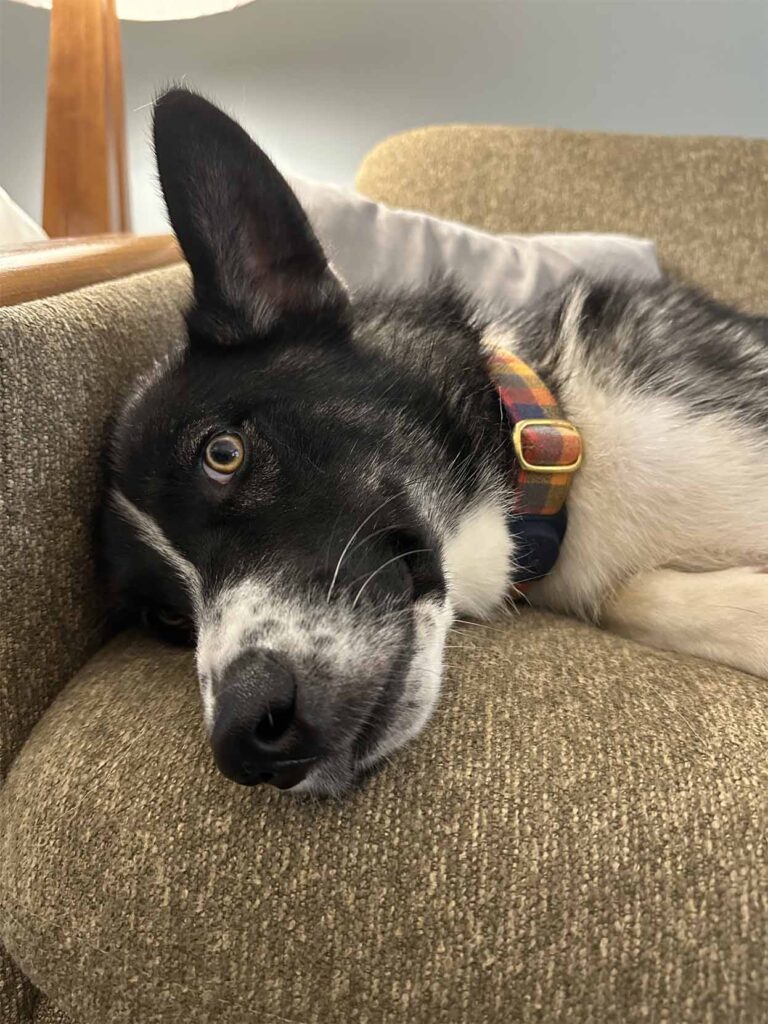 Finn sets a good example of how to relax and not sweat the small stuff. Sometimes he’s so relaxed that he doesn’t even get up when a client comes! He’s the only dog we’ve ever had who isn’t very comfortable being on a couch, so he’s not likely to snuggle up next to you. He will often lean on you for petting, though, and he frequently presents his belly for rubbing.