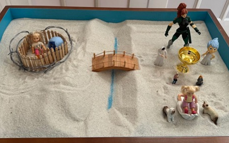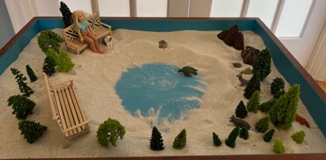 The sandtray can be used when we develop resources that support EMDR processing. An example is a safe / happy / calm / peaceful place that the client can go to mentally when needed. The client can use the sandtray to create the scene, which makes it easier to picture and to use during therapy.